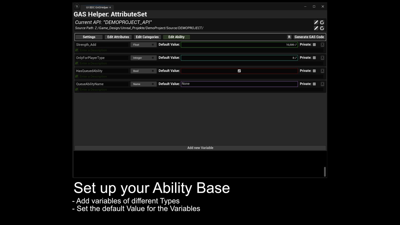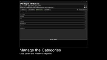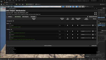 This small EditorUtility allows you to manage your GameplayAbilitySystem Attributes and Variables for the GameplayAbility Class. The generator creates the GAS corresponding source files, which include the Get/Set Functions for the Attributes.